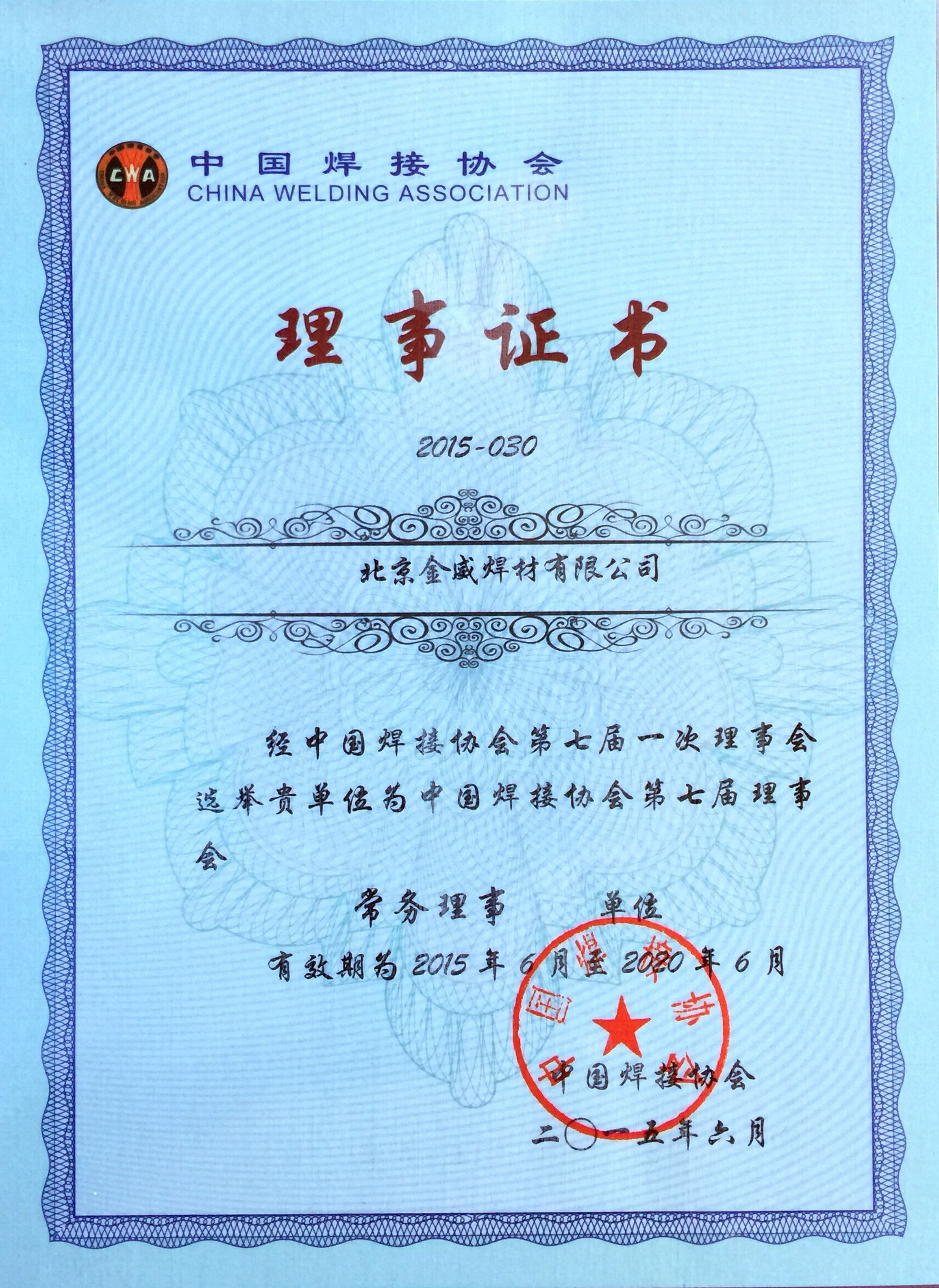 中國焊接協會常務理事單位證書